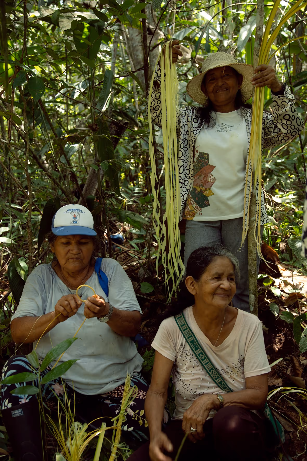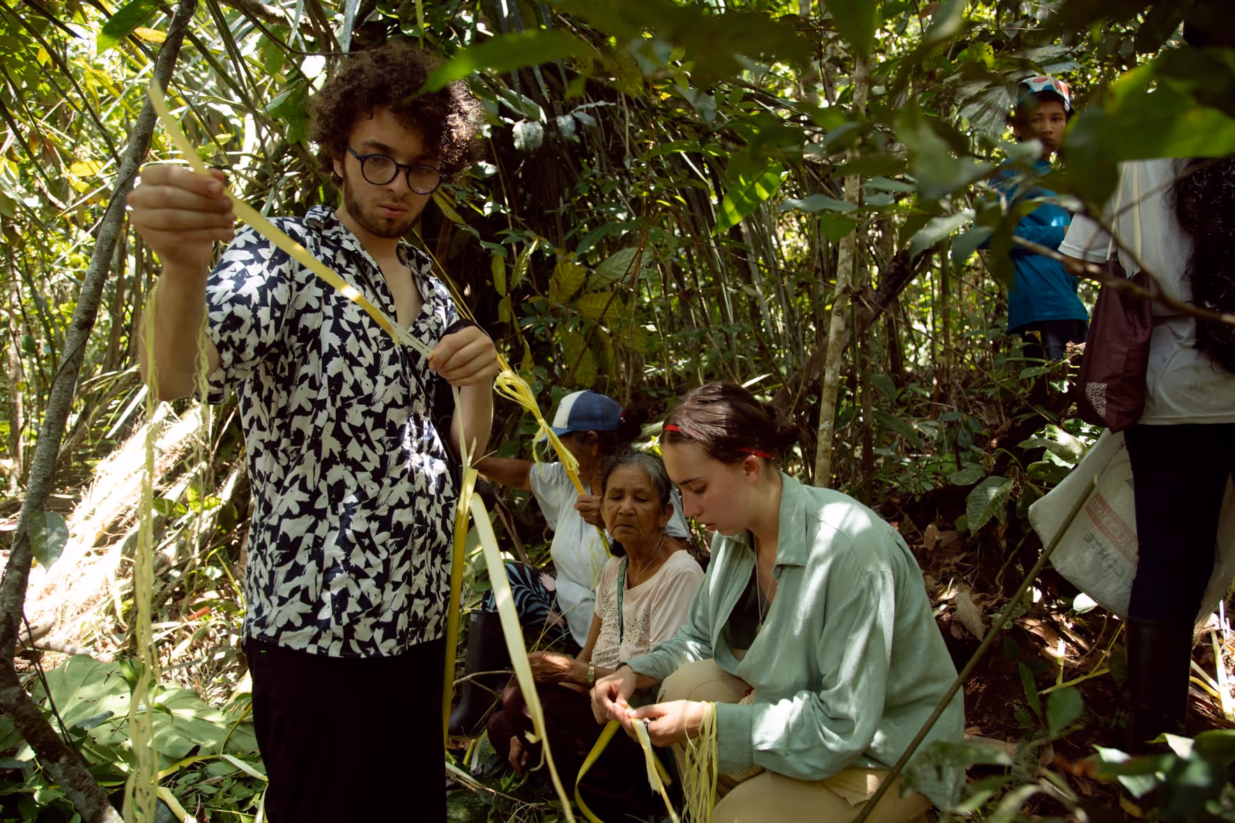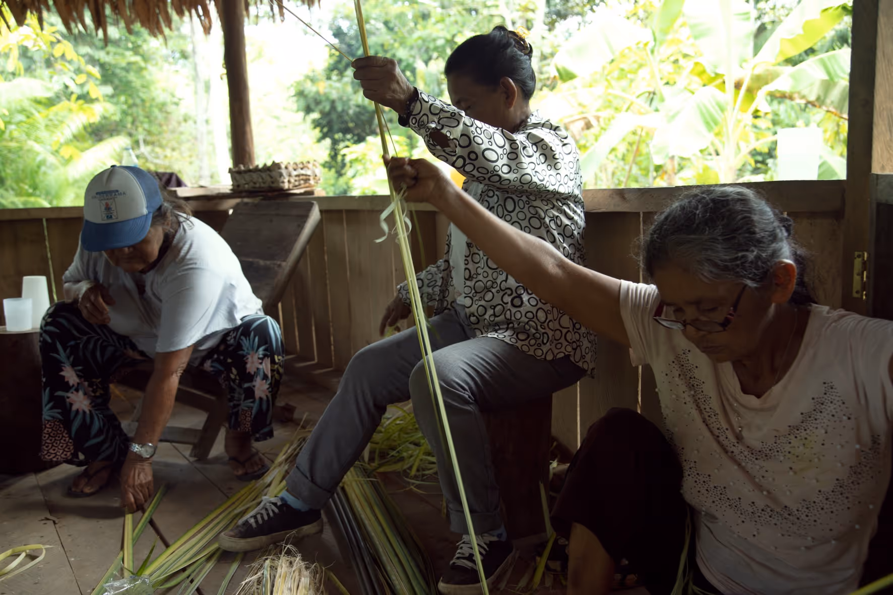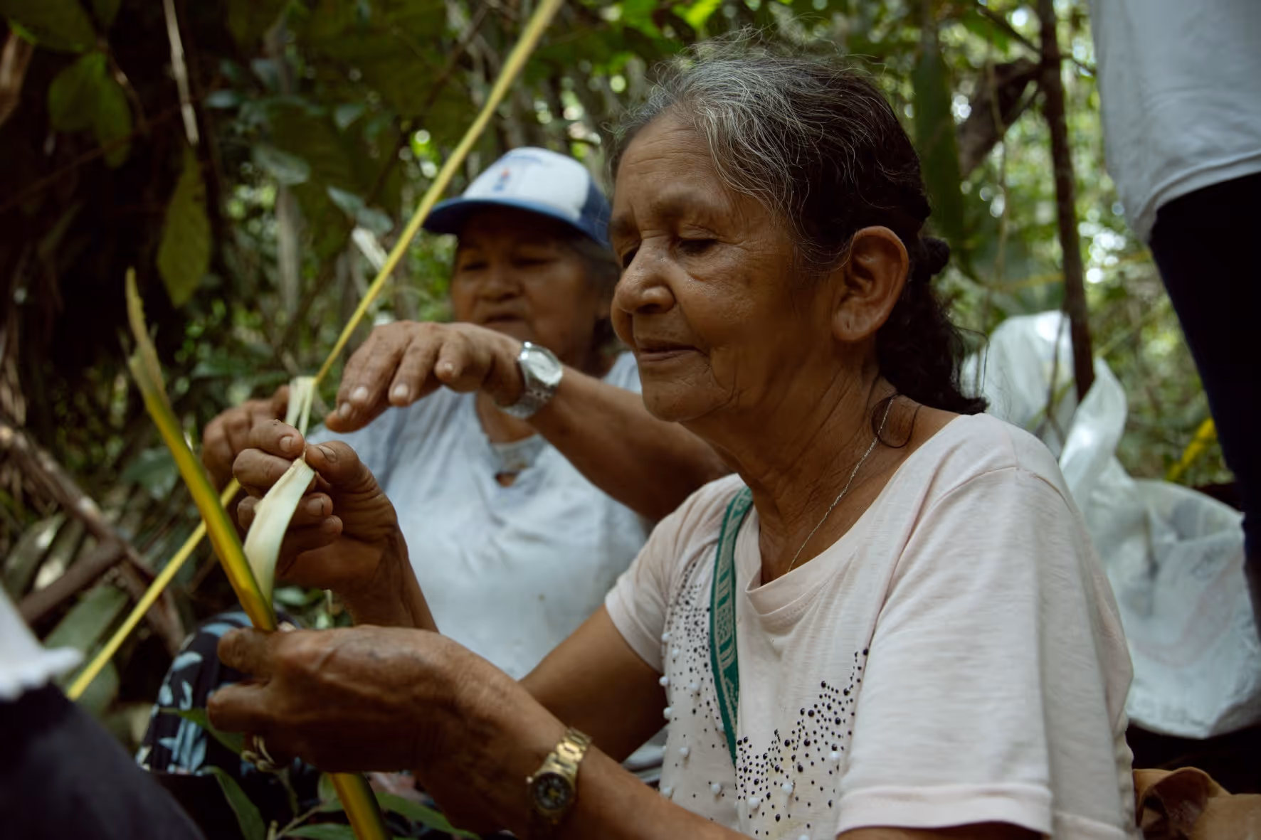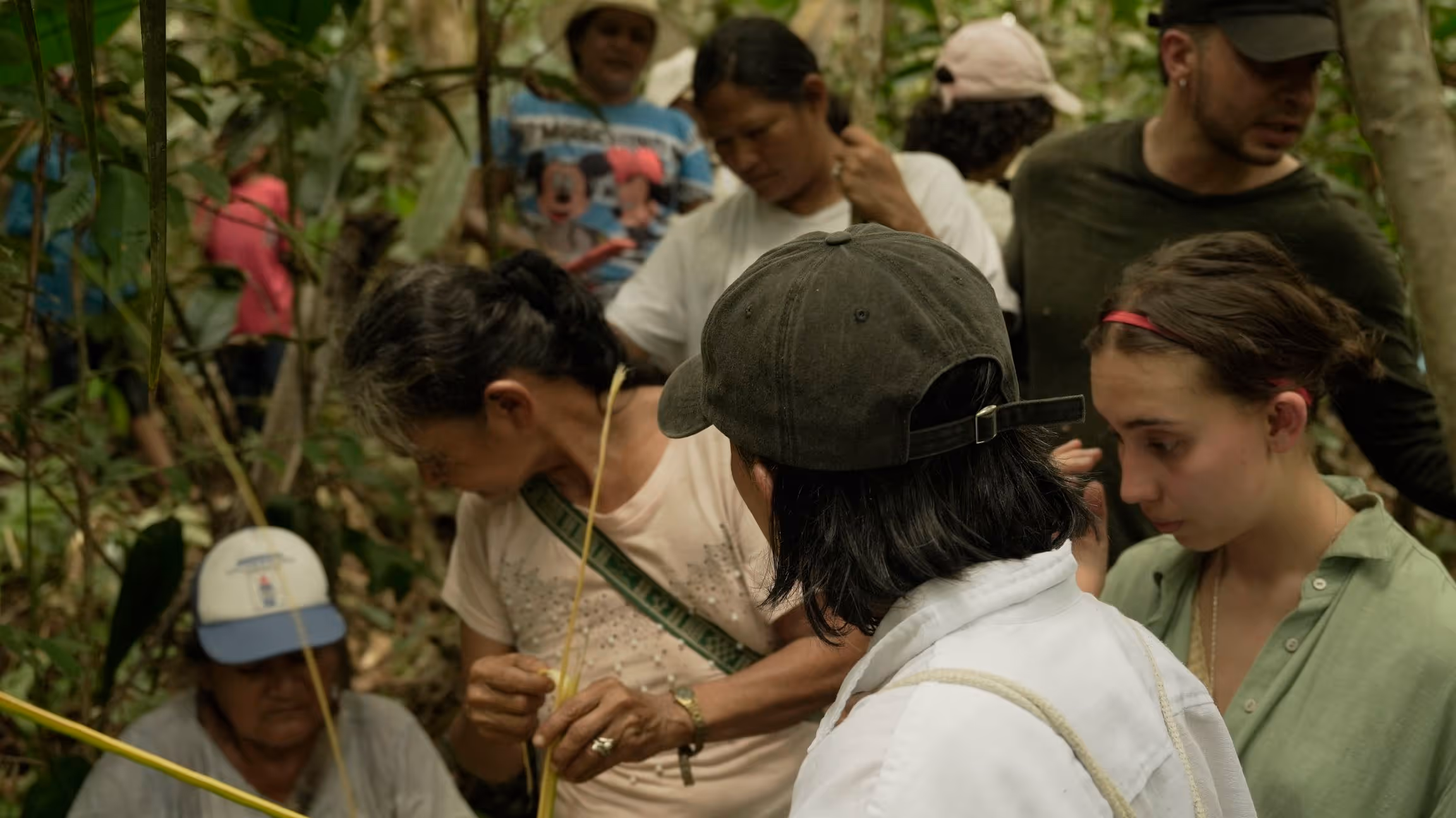 Después de un desayuno comunitario, nos preparamos para la caminata siguiendo la guía de la abuela Maria Helena quien nos explicó como pedir permiso con tabaco, copal, respeto e intención para entrar al monte antes de iniciar la caminata. Más que una caminata el recorrido fue una metodología viva para aprender, recordar y dialogar. La jornada cerró con el acuerdo de continuar el proceso desde la caminata, la palabra compartida y el respeto por los ritmos del territorio. Regresamos a la casa con depe y chambira, las abuelas empezaron a tejerse escobas y cernidores, quienes no sabíamos como hacerlo nos acercamos a aprender y si espontáneamente fueron surgiendo ideas y caminos posibles para seguir sembrando bien desde el conocimiento y la práctica del tejido Magüta.