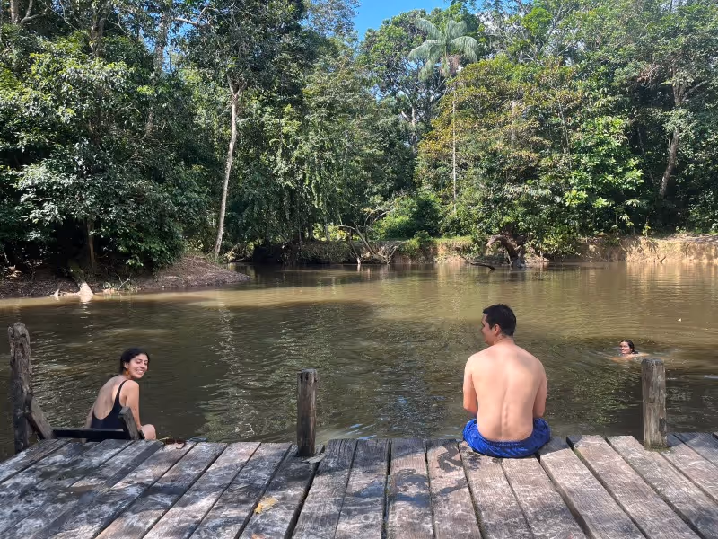Al finalizar esta jornada, que fue la última de taller, fuimos a conocer el balneario del km 8. Un lugar que tiene un muelle turístico para bañarse en el río Tacana. Allí pudimos relajarnos y asentar los pensamientos sobre el trabajo hecho. Luego, salimos a conocer el puesto callejero del Beiju, un lugar de venta de casabe en la esquina de la droguería gloria, pasando por Coca-Cola. Un sitio que se ha vuelto una parada obligatoria siempre que estamos en Leticia.