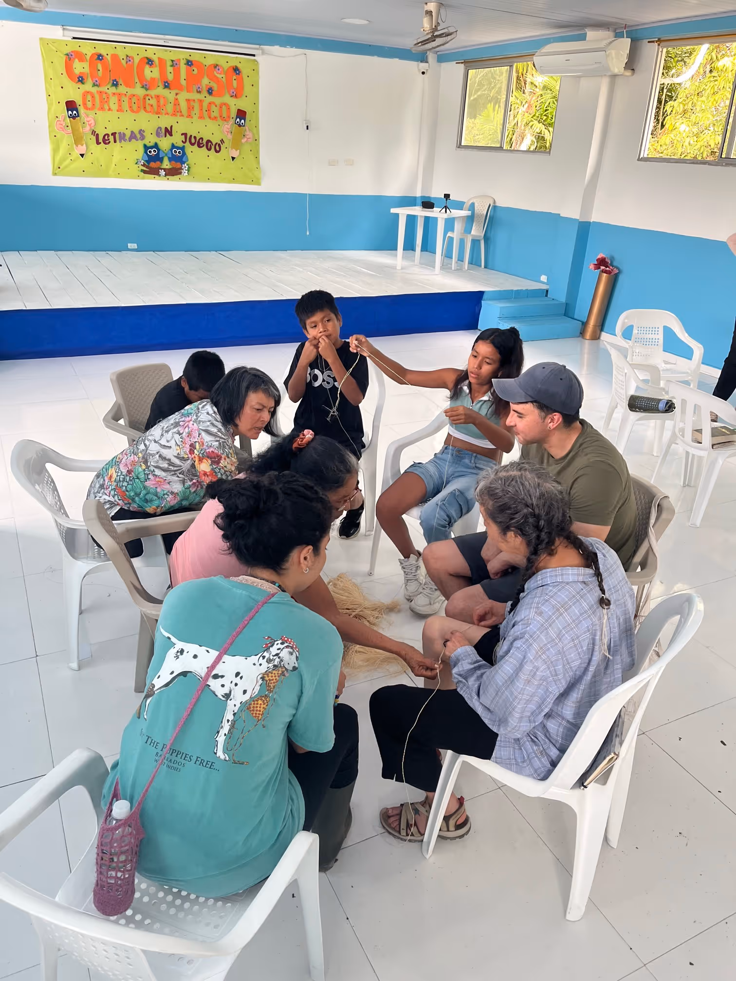 El 14 de abril, el grupo de avanzada vuelve del km 23 a Castañal y se prepara para recibir al resto del equipo que llegaba en el vuelo de las 5pm a Leticia. Nos encontramos en casa de Doña Marta todo el semillero y, como era de noche, decidimos espacios para guindar hamacas y dormir. Dado que éramos 15 personas, nos distribuimos en tres casas: Borboleta (bar de la comunidad), casa Parente Arámbula y la casa de Jaime. Amanecimos y fuimos a casa de Rodolfo y Nora a desayunar, quienes nos apoyaban con nuestra alimentación durante los siguientes cuatro días. Luego, se avisó por el perifoneo de la comunidad desde ese día empezábamos a ofrecer talleres de tejido, dibujo y audiovisual. Nos fuimos al colegio “Liceo los ángeles” donde nos dieron un espacio para convocar a la comunidad y realizar los talleres.