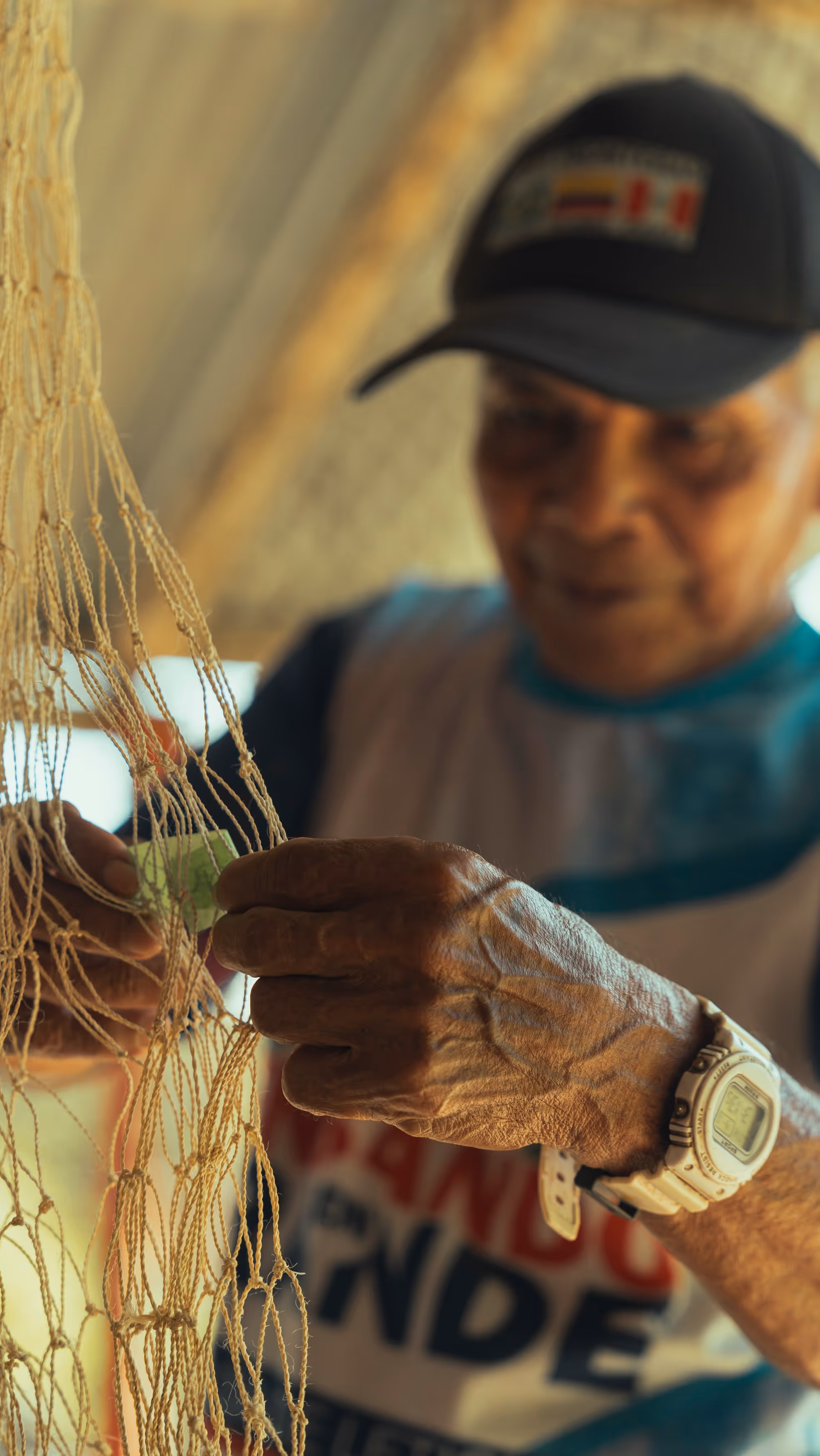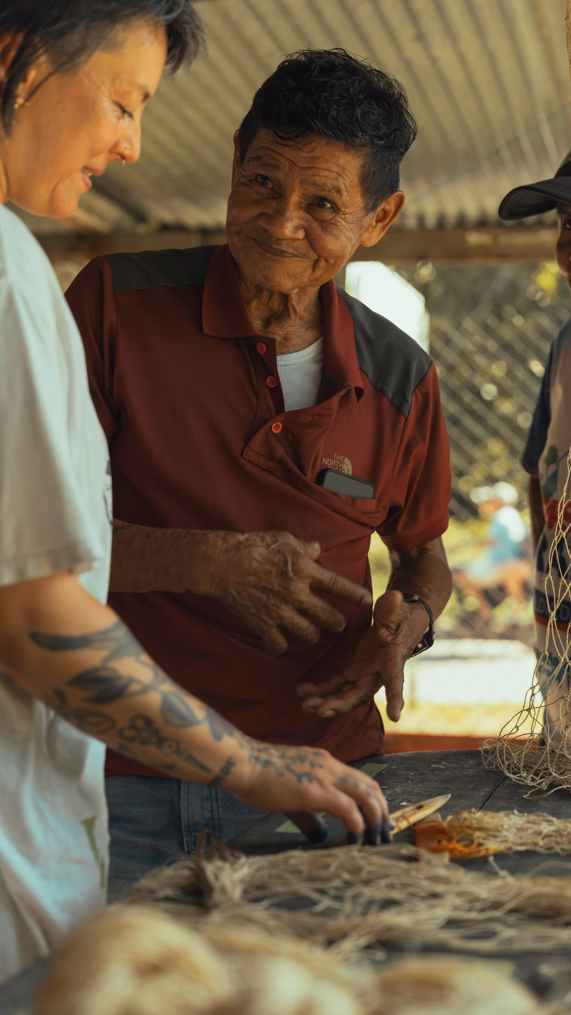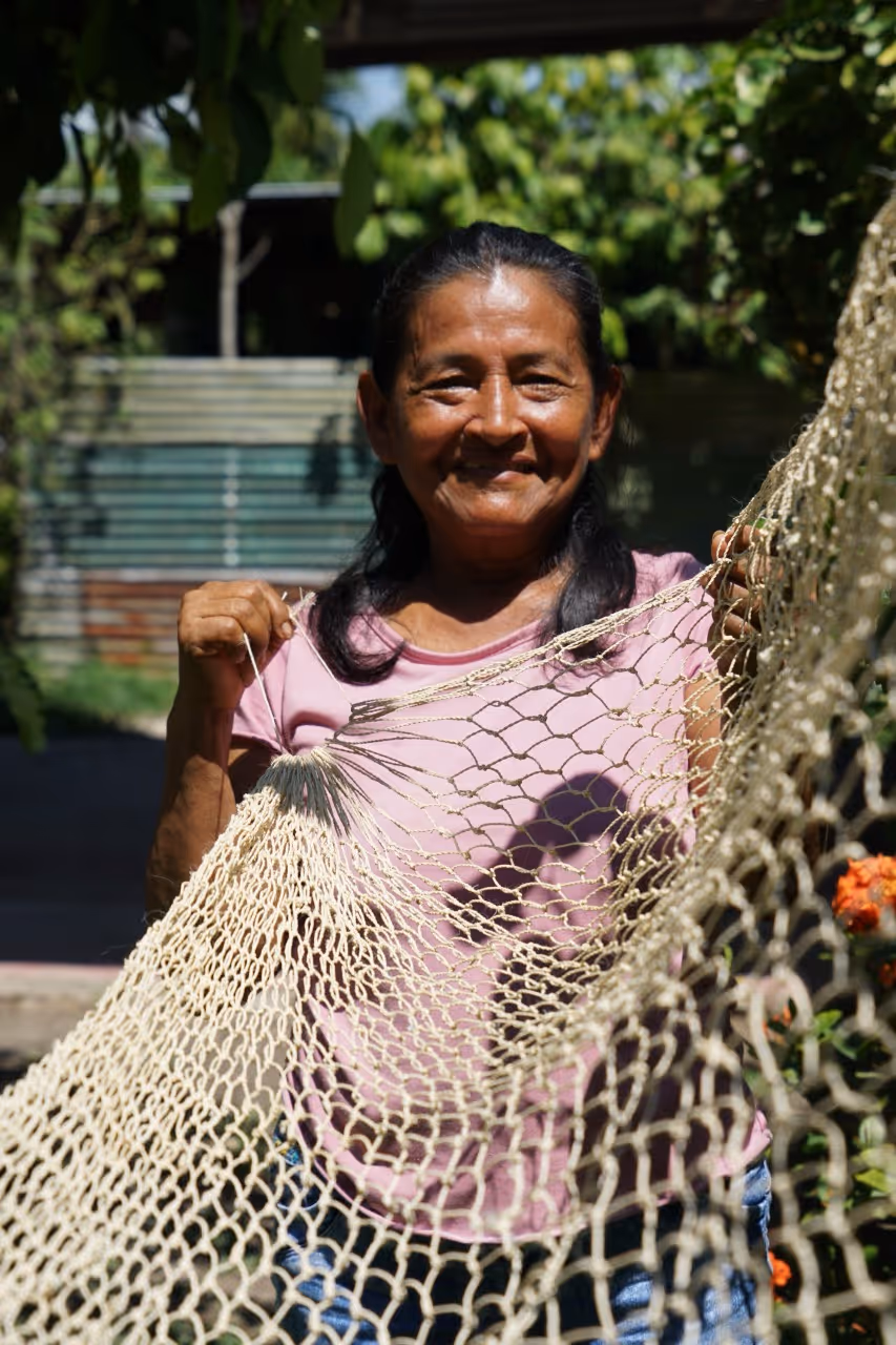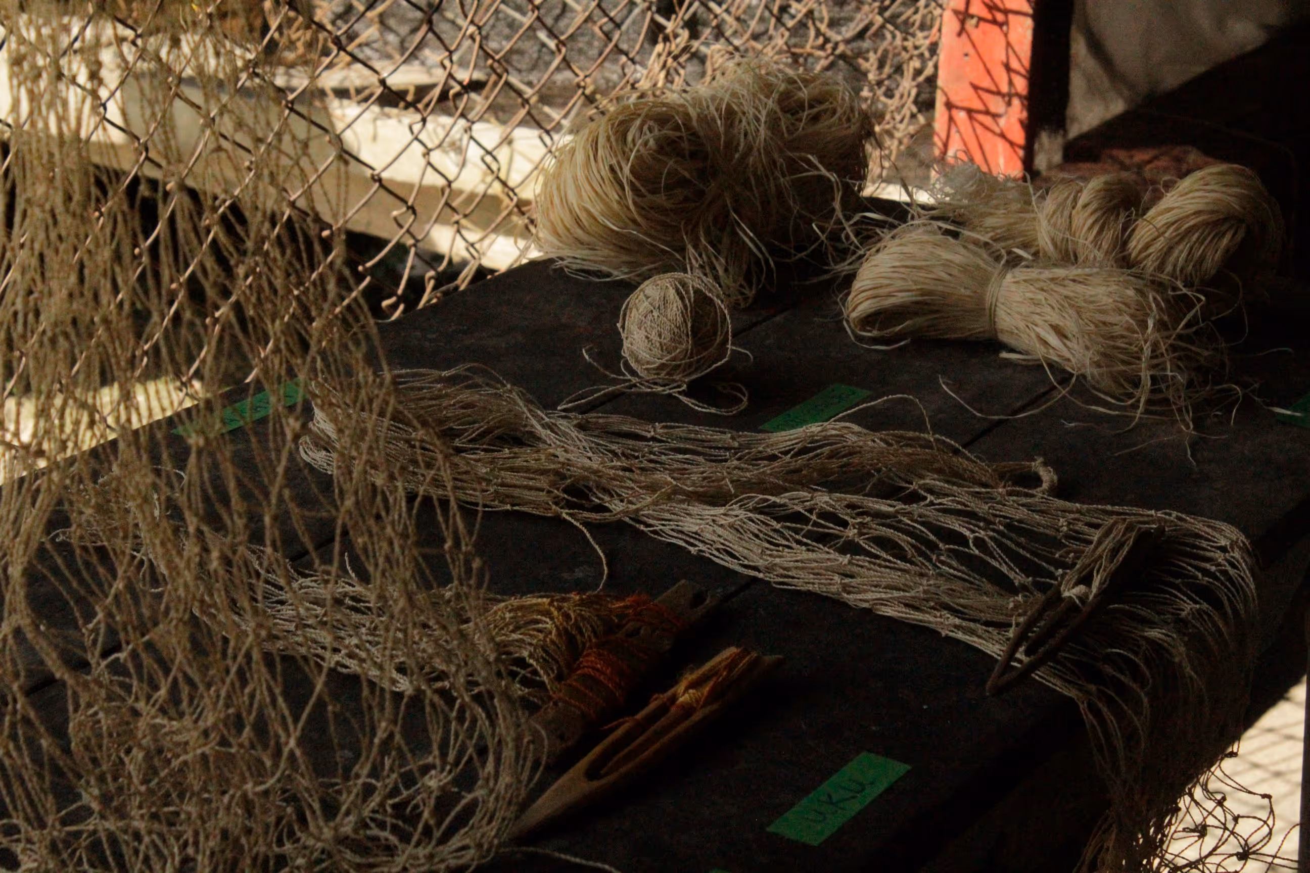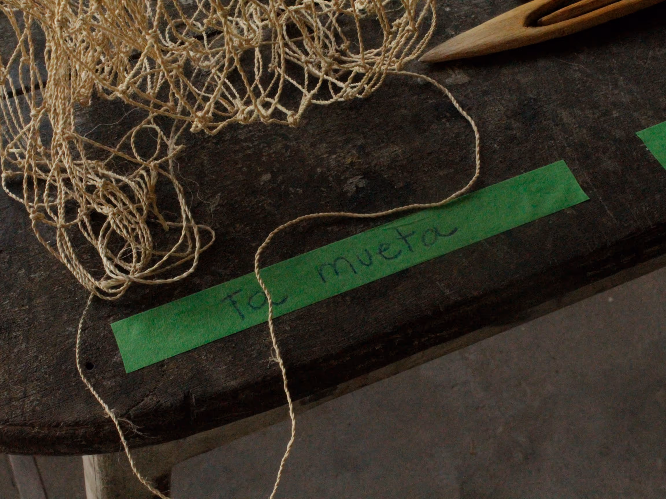 Los primeros asistentes fueron abuelos y niños interesados en tejido. M recuerda que fue Don Eladio quien tomó la iniciativa y empezó a enseñarnos a tejer una hamaca con fibras de plástico. El tejido es el mismo usado para tejer redes de pescar. Mientras que la abuela Helena nos mostró cómo hilar la chambira y con un poco de chambira hilada, le compartió a Juanita el tejido de mochila que había aprendido de su madre. Luego de encontrarnos con hamacas y mochilas, nuestra idea de taller se convirtió en un espacio de conversación y práctica donde el tejido era el catalizador de memoria y transmisión de historias —cuenta Juanita—. Así, mientras torcíamos chambira o anudábamos la atarraya, íbamos compartiendo historias, preguntas y aprendizajes.