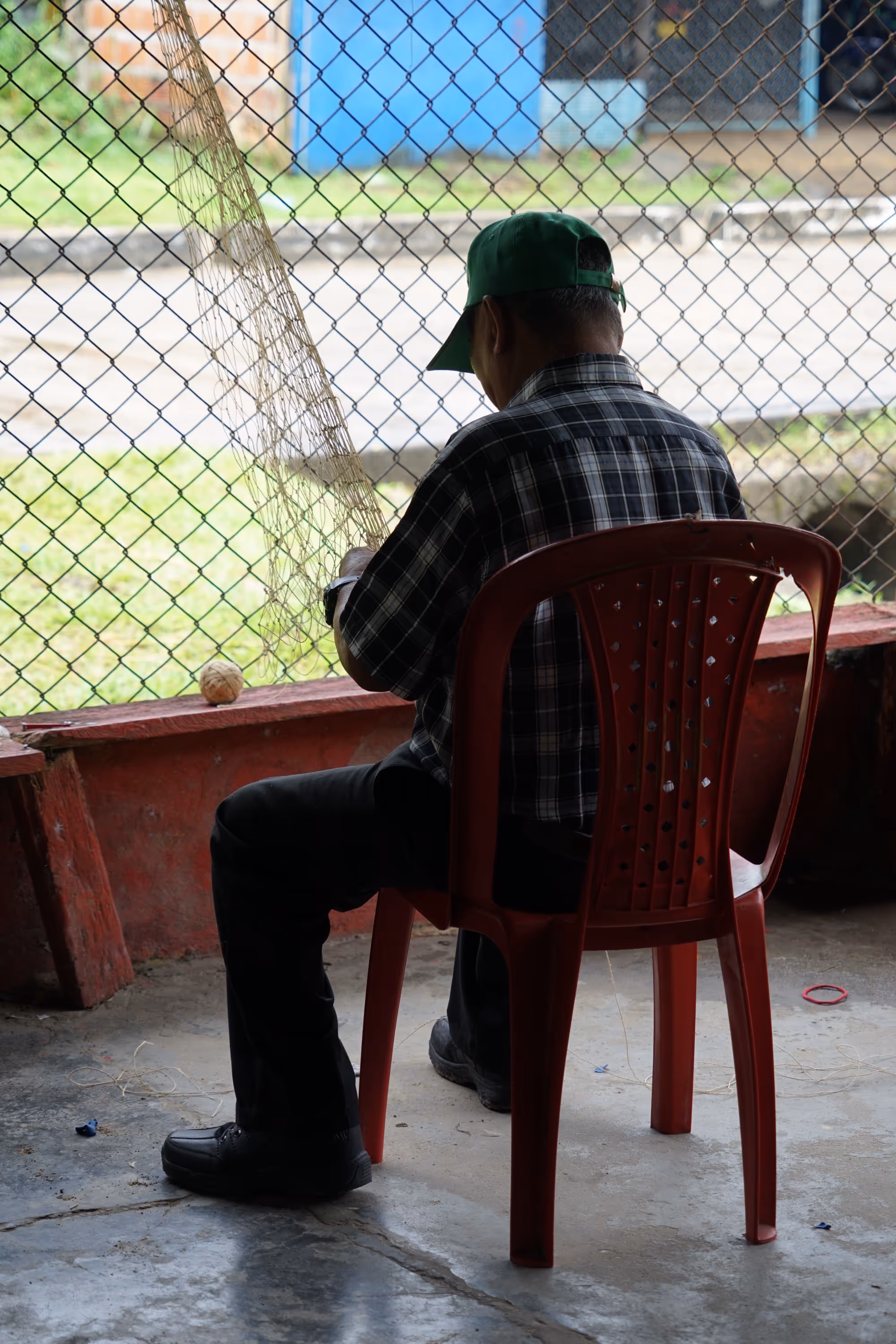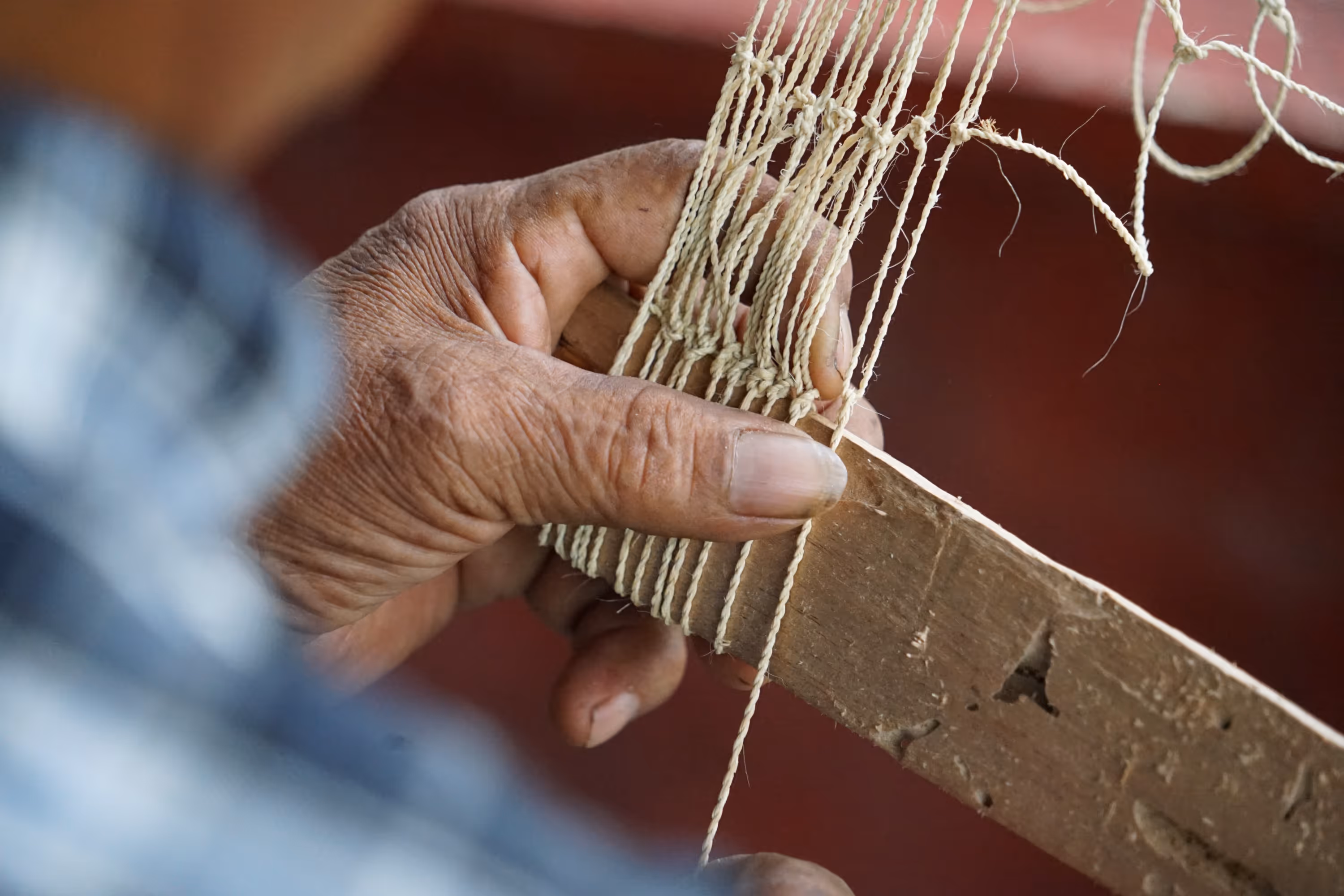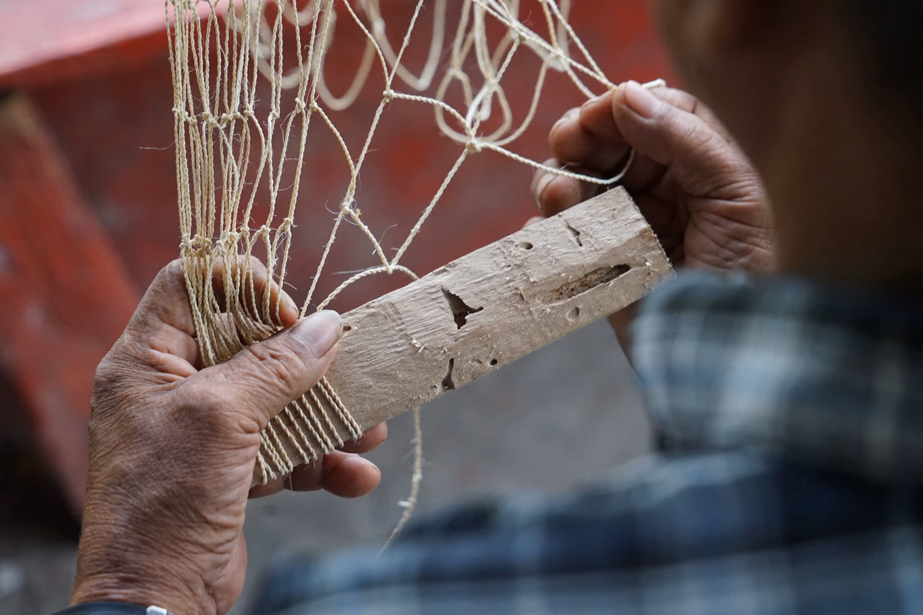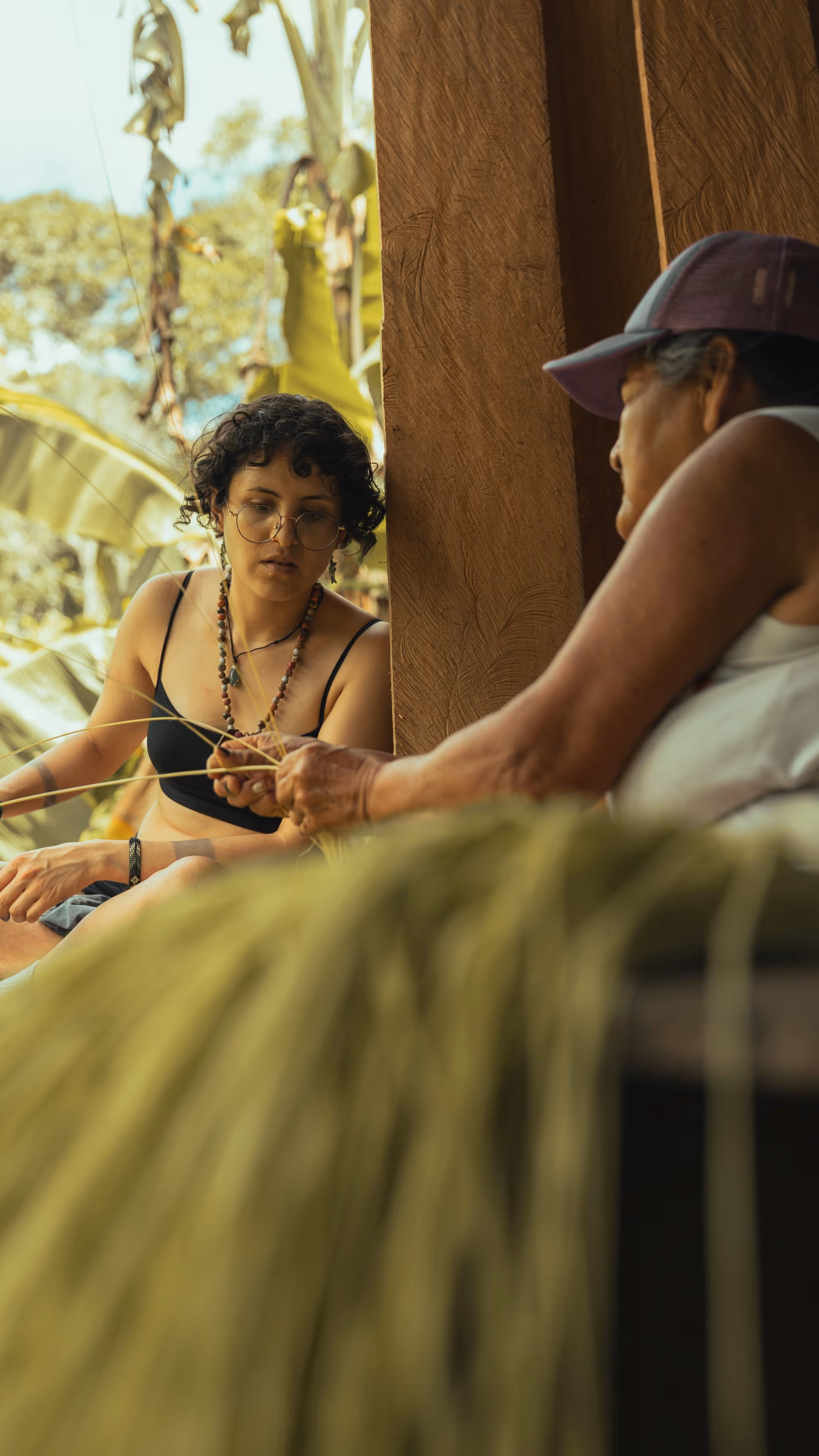 Los primeros asistentes fueron abuelos y niños interesados en tejido. M recuerda que fue Don Eladio quien tomó la iniciativa y empezó a enseñarnos a tejer una hamaca con fibras de plástico. El tejido es el mismo usado para tejer redes de pescar. Mientras que la abuela Helena nos mostró cómo hilar la chambira y con un poco de chambira hilada, le compartió a Juanita el tejido de mochila que había aprendido de su madre. Luego de encontrarnos con hamacas y mochilas, nuestra idea de taller se convirtió en un espacio de conversación y práctica donde el tejido era el catalizador de memoria y transmisión de historias —cuenta Juanita—. Así, mientras torcíamos chambira o anudábamos la atarraya, íbamos compartiendo historias, preguntas y aprendizajes.