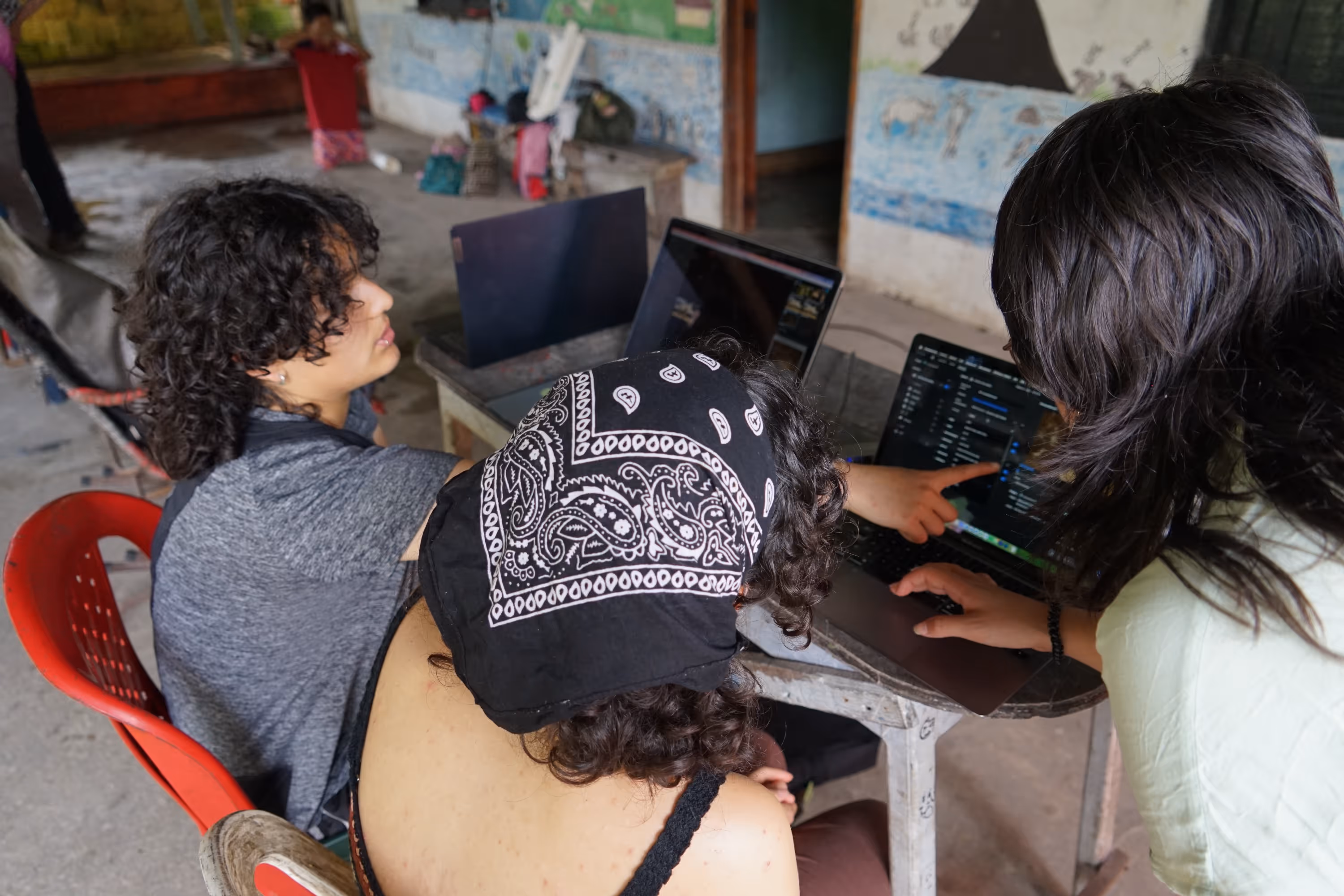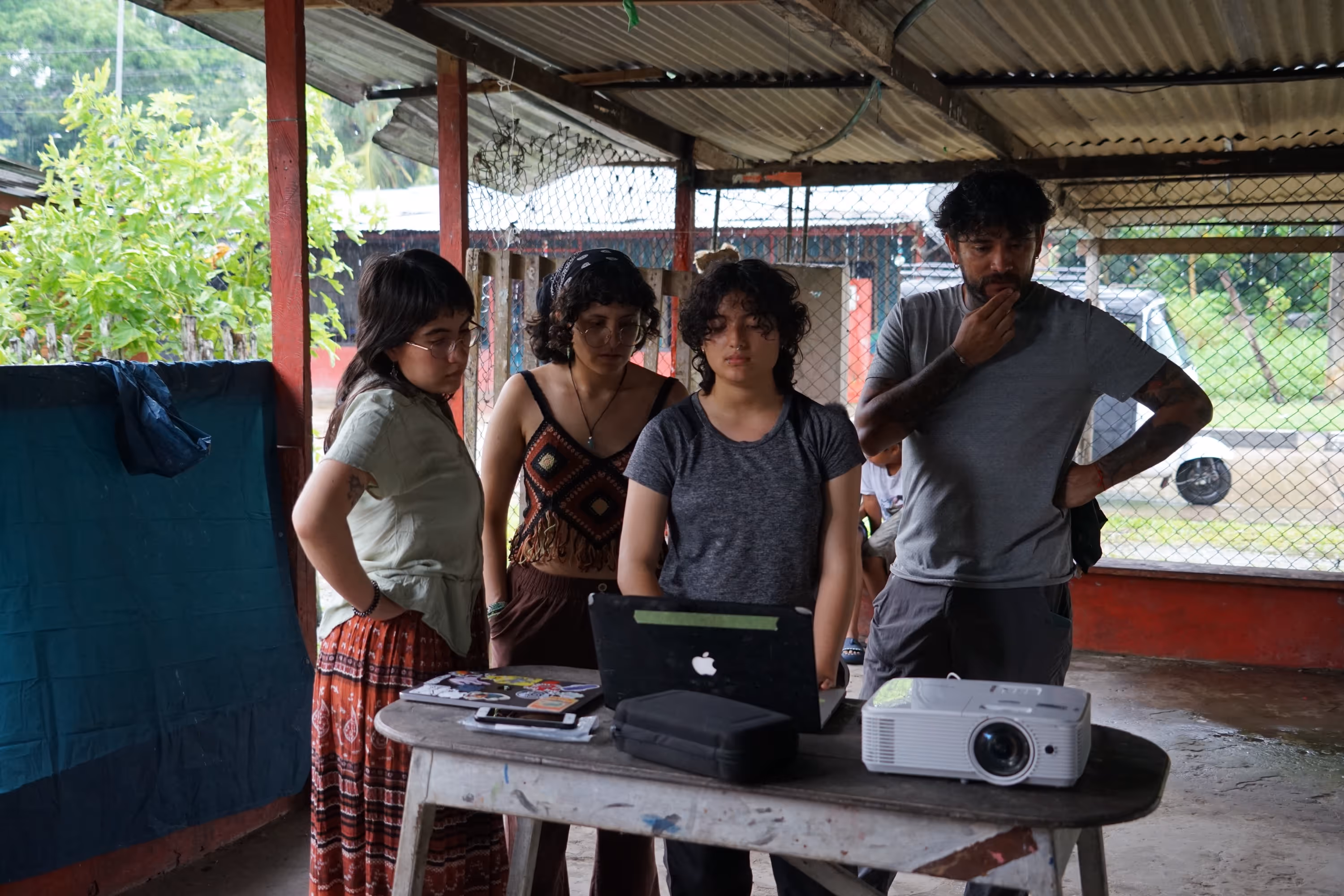 En nuestras reuniones previas a la entrada a campo pensamos que trabajaríamos de manera aislada en tres temáticas —audiovisual, textil, ilustración— y que desarrollaríamos un proceso estructurado de formación técnica: uso de cámaras, grabadoras, programas de edición, ejercicios de autorretrato, video en vivo e incluso una introducción al audiovisual expandido con mapping y programas de diseño sonoro. Nuestra planificación inicial fue ambiciosa. Sin embargo, desde el primer encuentro entendimos que el proceso sería otro. Ese primer día compartimos nociones básicas sobre el uso de cámaras y grabadoras, mostramos los equipos que llevábamos y cómo utilizarlos. Pero, al intercambiar intereses con el grupo, el taller cambió: ahora teníamos una nueva agenda co-decidida.