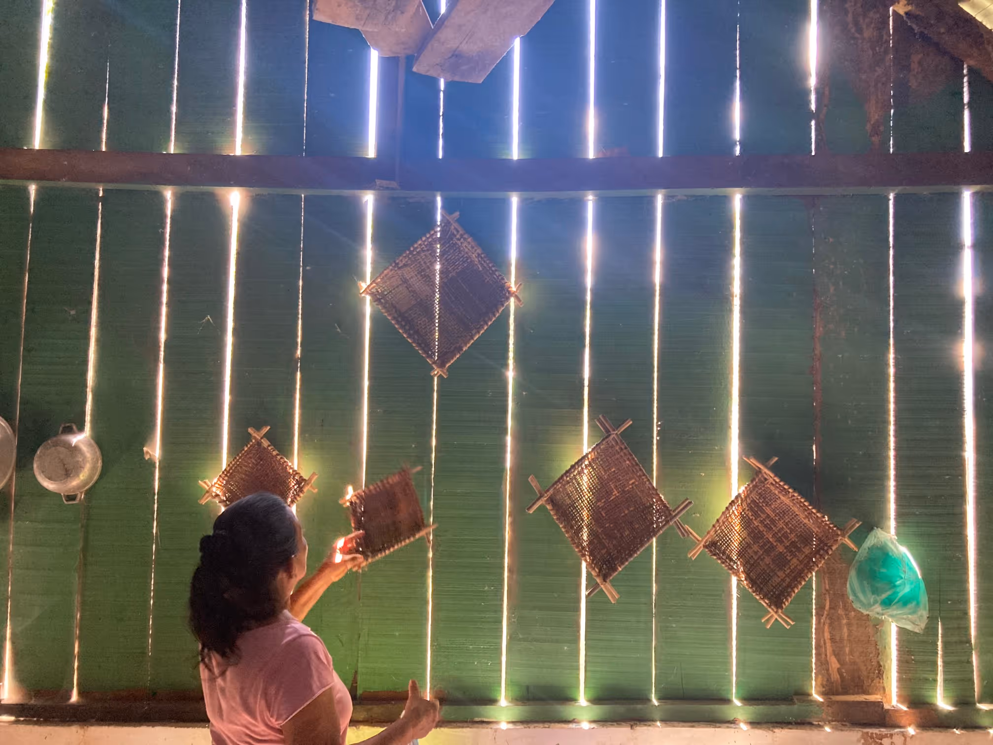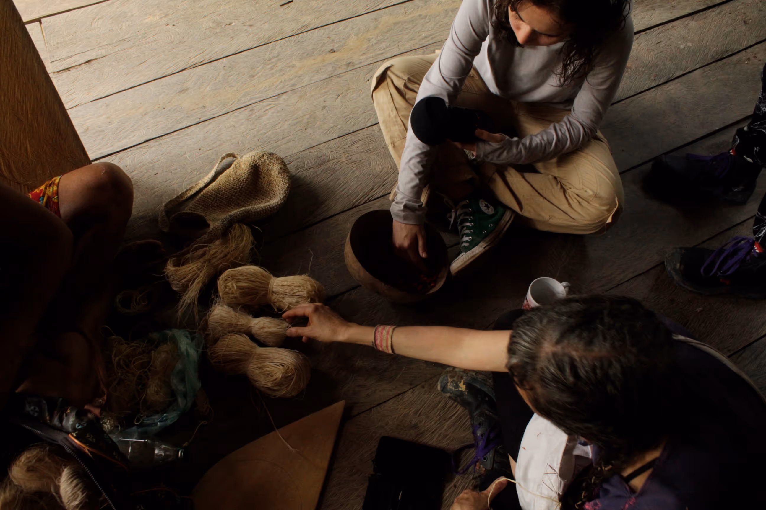 El viernes 11 de abril aterrizaron en Leticia el grupo de avanzada, estando allá se dirigieron al km 2.5 al Castañal, a casa de Doña Marta y Don Sebastián, la casa Parente Arámbula. Esta es la casa familiar de Jhon Sebastián, donde nos quedamos mientras estuvimos en Castañal. Compartimos con Karol, Ivan, los abuelos y los nietos de la familia. Como llegamos un par de días antes al resto del grupo, empezamos visitando los objetos tejidos. Al llegar a Leticia, a la casa de la familia Parente, doña Martha empezó este hilo de conversaciones alrededor del tejido y el hilado. Doña Martha nos contó que su mamá le enseño a hilar, y que aún tenía guardada chambira que hilaban con ella. Esa misma noche, sacó la fibra y nos mostró cómo se hilaba torciéndola con la mano sobre la pierna.