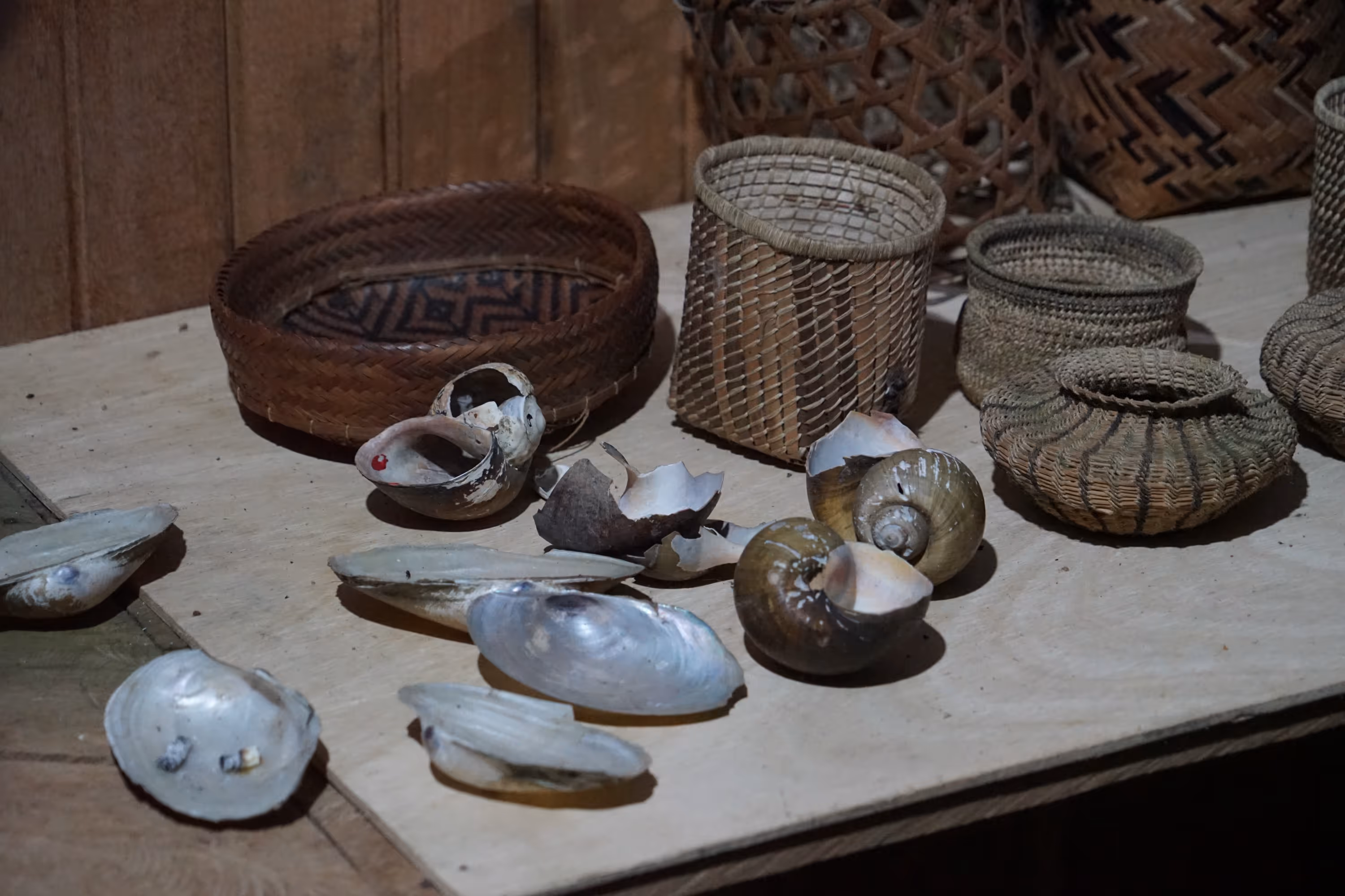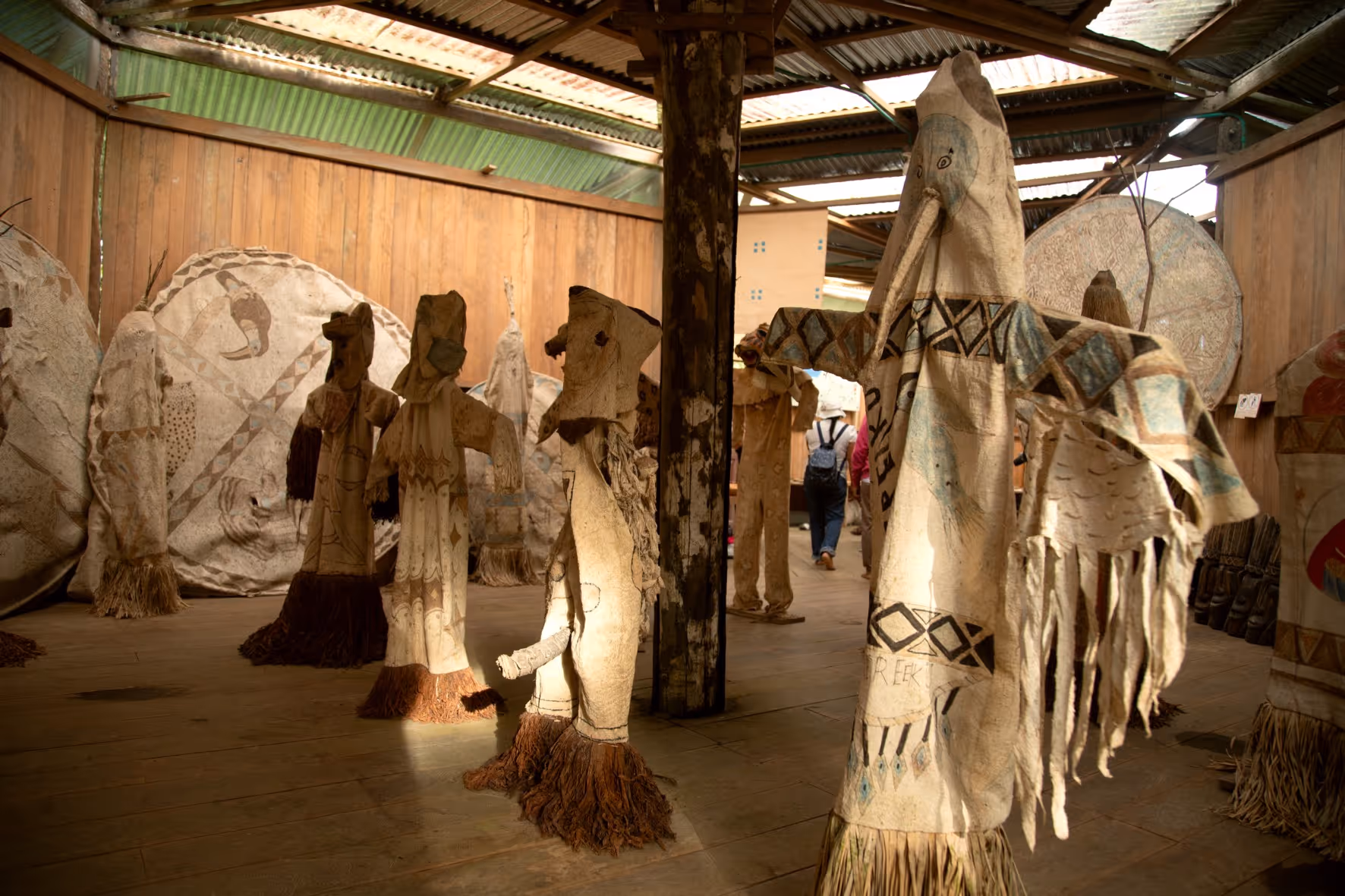Luego, junto con las abuelas sabedoras de la comunidad del Castañal de los Lagos, visitamos el Museo Etnográfico Magüta, ubicado en la comunidad de Mocagua, dirigido por el profesor Abel Santos-Angarita, quien nos ha guiado en el proceso y ha sido un apoyo fundamental para acercarnos a los mundos Magütá. Recorrimos por segunda vez el museo y sus objetos pero esta vez acompañad_s de las abuelas, el tacto y las historias. Y las abuelas encontraron memorias que solo los objetos podrían enactar. Hace mucho no veían algunos de los canastos, cernidores, tipitis que el museo resguarda, lo que detonó conversaciones y ganas de tejer y recuperar técnicas en peligro de desaparición.Por medio de los objetos expuestos en el museo las abuelas rememoraron el Yüü, ritual de paso de las mujeres magüta, danzando y explicando el uso de los objetos y el papel de cada personaje del baile.