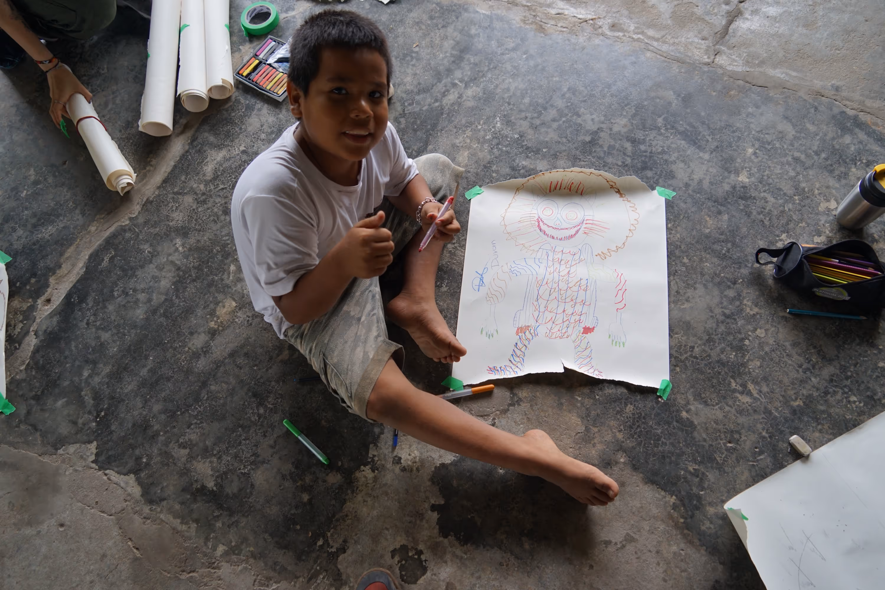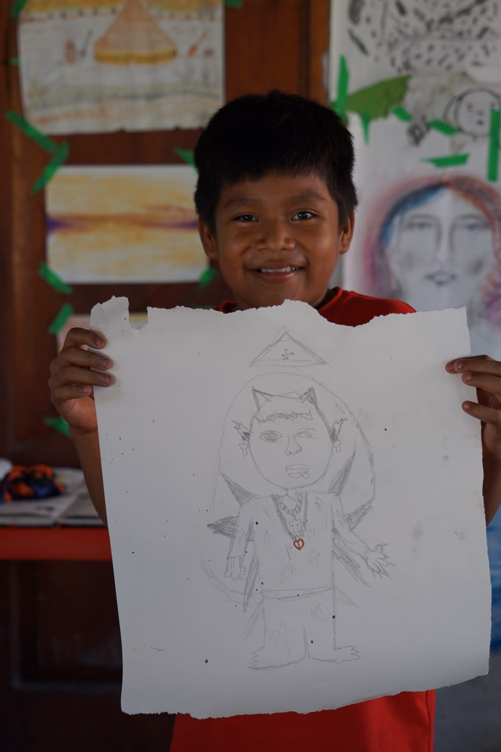 Luego, empezaron a llegas más y más niños y niñas interesados en aprender a dibujar. El taller de dibujo lo desarrollamos principalmente con niños y jóvenes de la comunidad, en un rango amplio de edades —entre los 5 y los 19 años—, lo cual nos llevó a adaptar constantemente las actividades. Antes del viaje planeamos ejercicios de integración como el cadáver exquisto, dibujar a ciegas o experimentar con distintos materiales en secuencia, recuerda Shaiel. La propuesta inicial había surgido de un taller de fanzine que luego se transformó en taller de dibujo, y aunque llegamos con un plan, “el día antes del viaje ya habíamos cambiado la mitad y en territorio todo se transformó de nuevo”. La Semana Santa y las actividades religiosas hicieron que muchos niños no pudieran asistir, y quienes llegaron tenían tiempos de concentración muy diferentes, lo que nos llevó a personalizar los ejercicios según sus intereses.