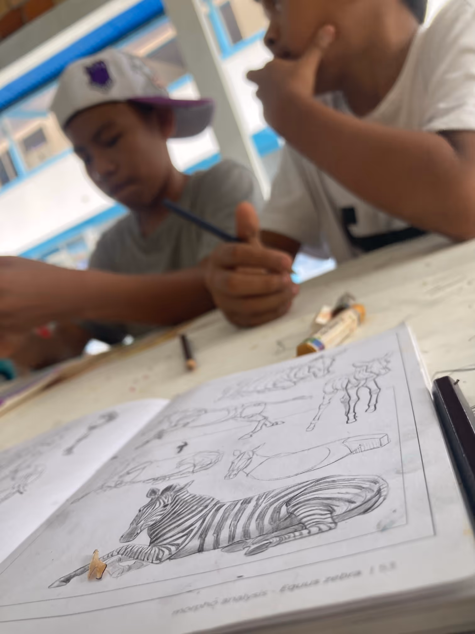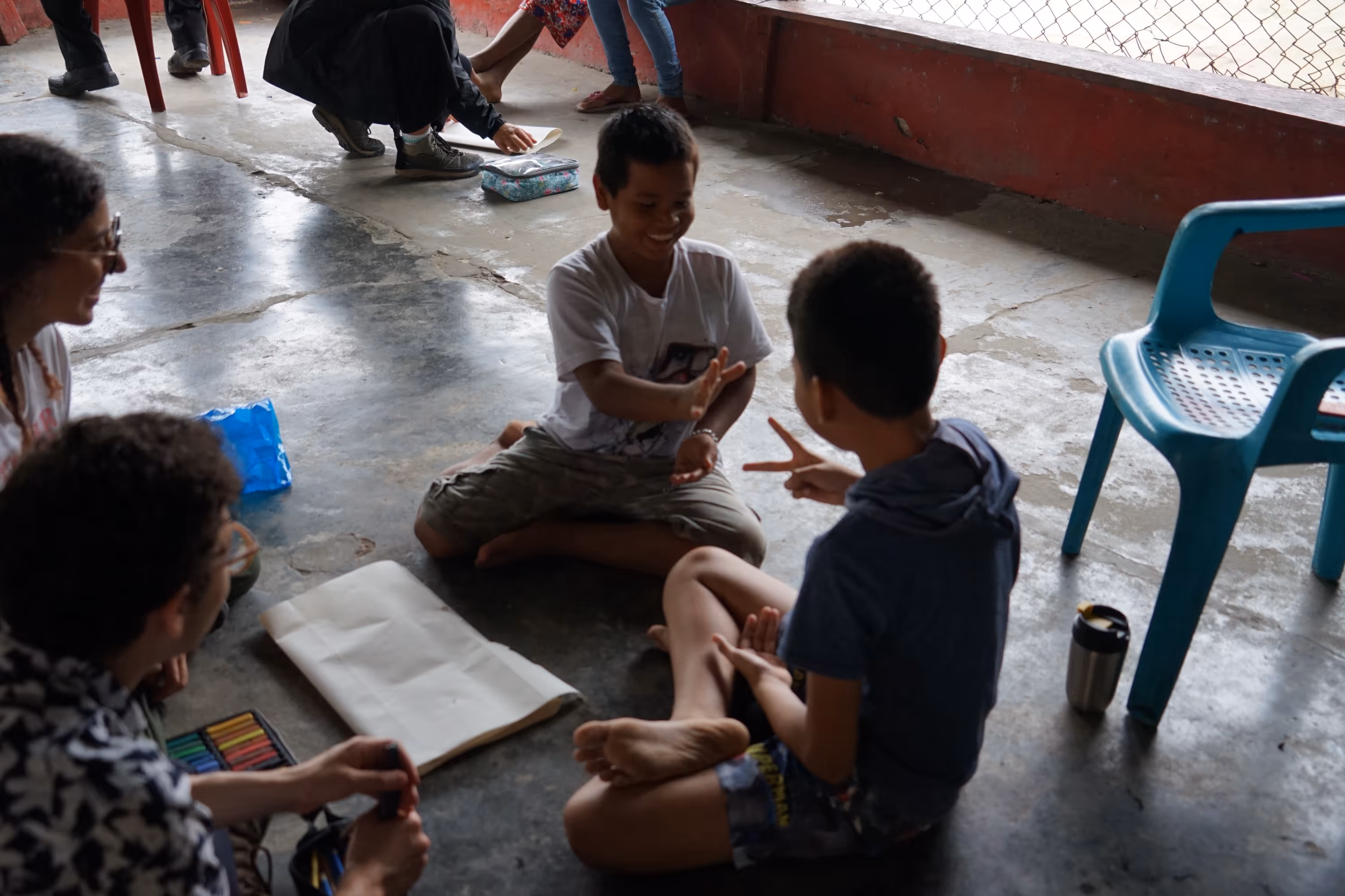 Por su parte el taller de dibujo también avanzó. Sofía, que se unió al grupo de dibujo en la segunda jornada, recuerda a Maí, un niño que también es integrante de los Hijos del Huito y que prefería comunicarse por señas. “Él me dibujó a mí, y yo lo dibujé a él, mientras seguía las instrucciones de Sarigueya. No hablaba mucho, pero su destreza y su interés por el dibujo me llenaron por dentro; me cuestionaba de maneras técnicas y personales al mismo tiempo”. Ver ese entusiasmo fue una confirmación de que el dibujo generaba vínculos profundos más allá de lo técnico.