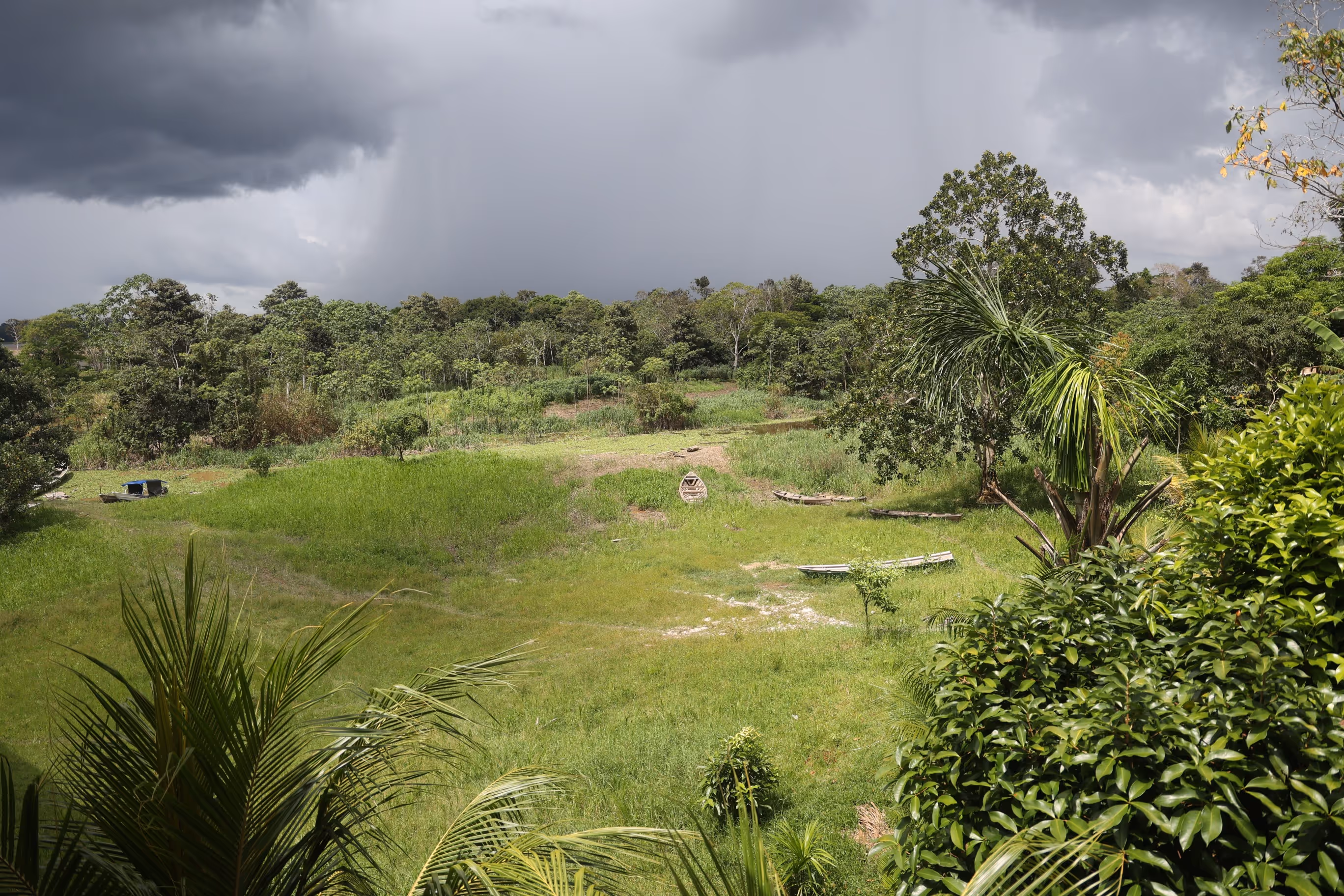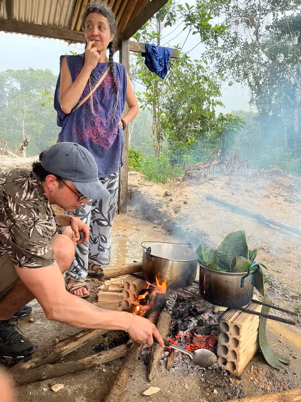 Llegamos a Arara, nos recibió la quema de la chagra que estaban rotando. Nos había acompañado todo el camino una perrita llamada Mona. En Arara nos enconstramos con Baudilio, vicecuraca que nos recibió en la construcción de su horno de fariña. Allí nos dijo que llegaramos con clama, que nos bañaramos en la quebrada e hiciéramos almuerzo. Luego por la noche nos veríamos con el cabildo en la Maloka. A mi Ssara) y a Shaiel nos mandaron a buscar algo de proteína para el almuerzo en la comunidad. Llegamos a una tienda que era al lado de la Maloka y compramos calabresa. Cuando nos estábamos devolviendo al lugar donde teníamos haciendo el almuerzo, empezó a llover. Nos resguardamos en un techo chiquitito, y eventualmente salimos y corrimos al fogón. Pudimos cocinar y hacer un comedor con platos de hoja de plátano. Almorzamos con Baudilio y su hijo Andresito. Luego, fuimos a la Maloka, lugar donde nos reuniríamos y luego, nos quedaríamos a dormir.