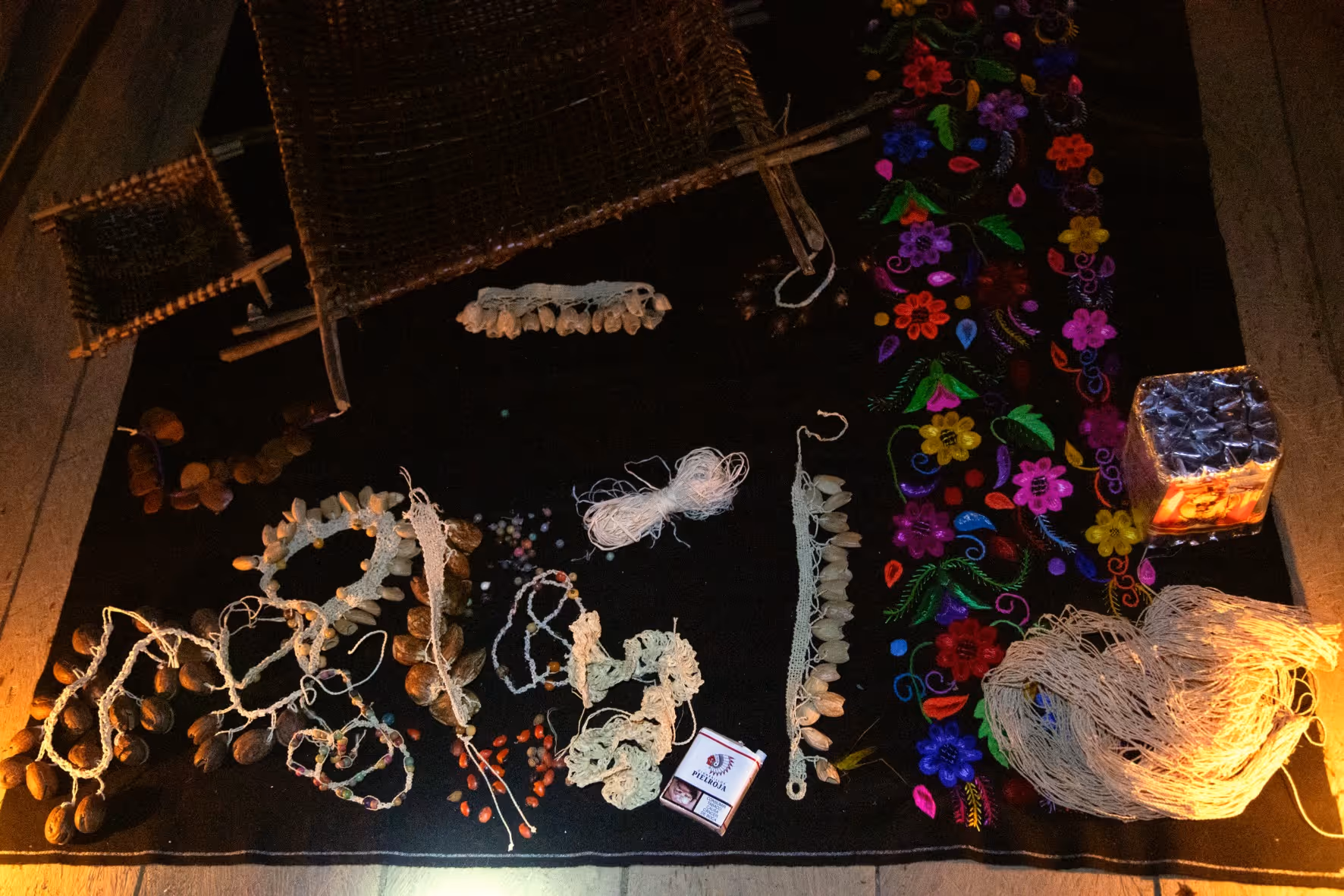Posteriormente, realizamos una serie de preguntas abiertas con el fin de dinamizar la conversación desde la cotidianidad, la intimidad, la memoria y lo colectivo-comunitario, y de servir como base para planear un recorrido del monte en el resguardo que permitiera reconocer los lugares donde se encuentran las plantas que se utilizan en la elaboración de objetos cotidianos tejidos. Pasamos la noche juntos en el resguardo, con la expectativa de recorrer el monte al dia siguiente.