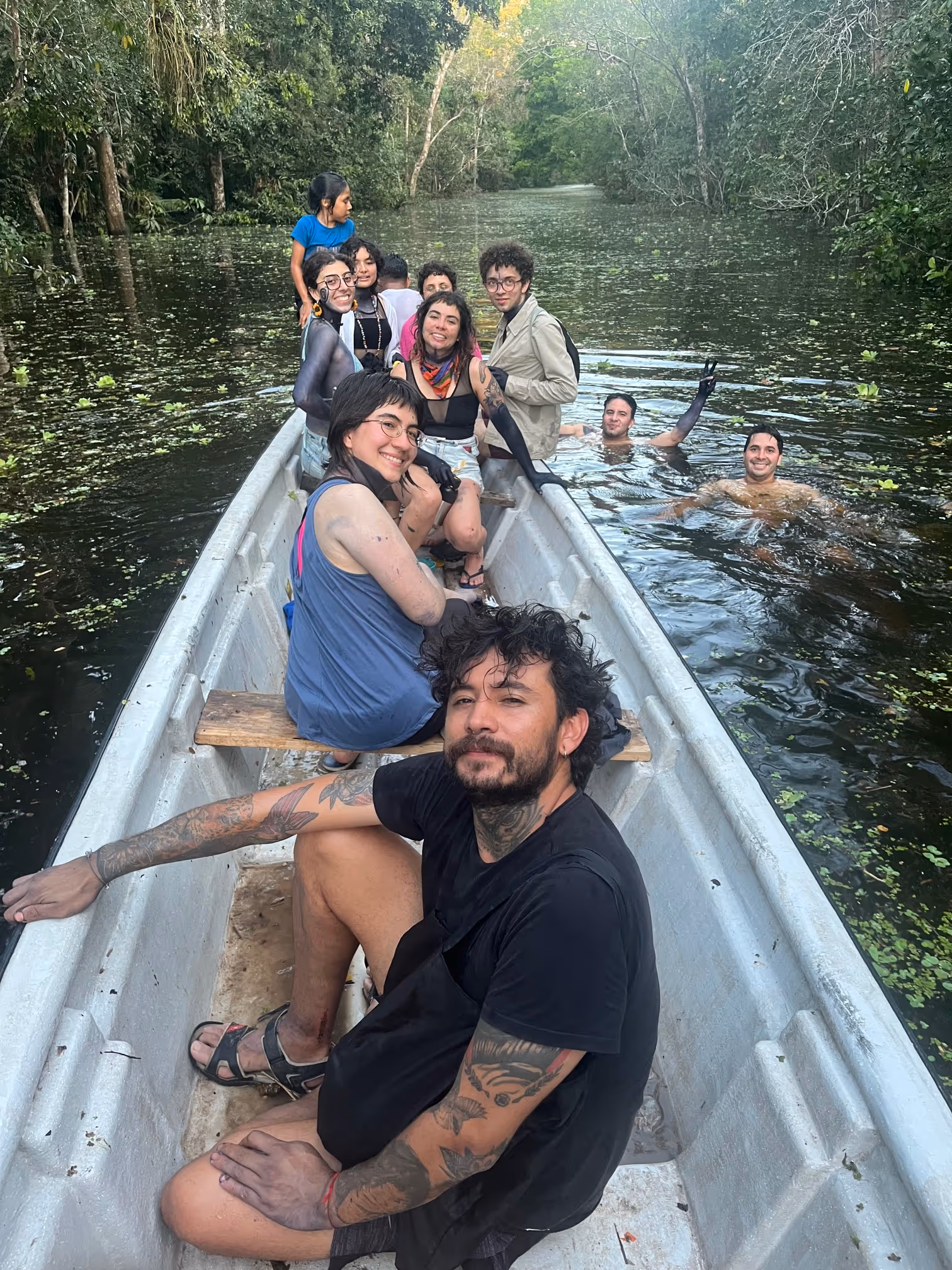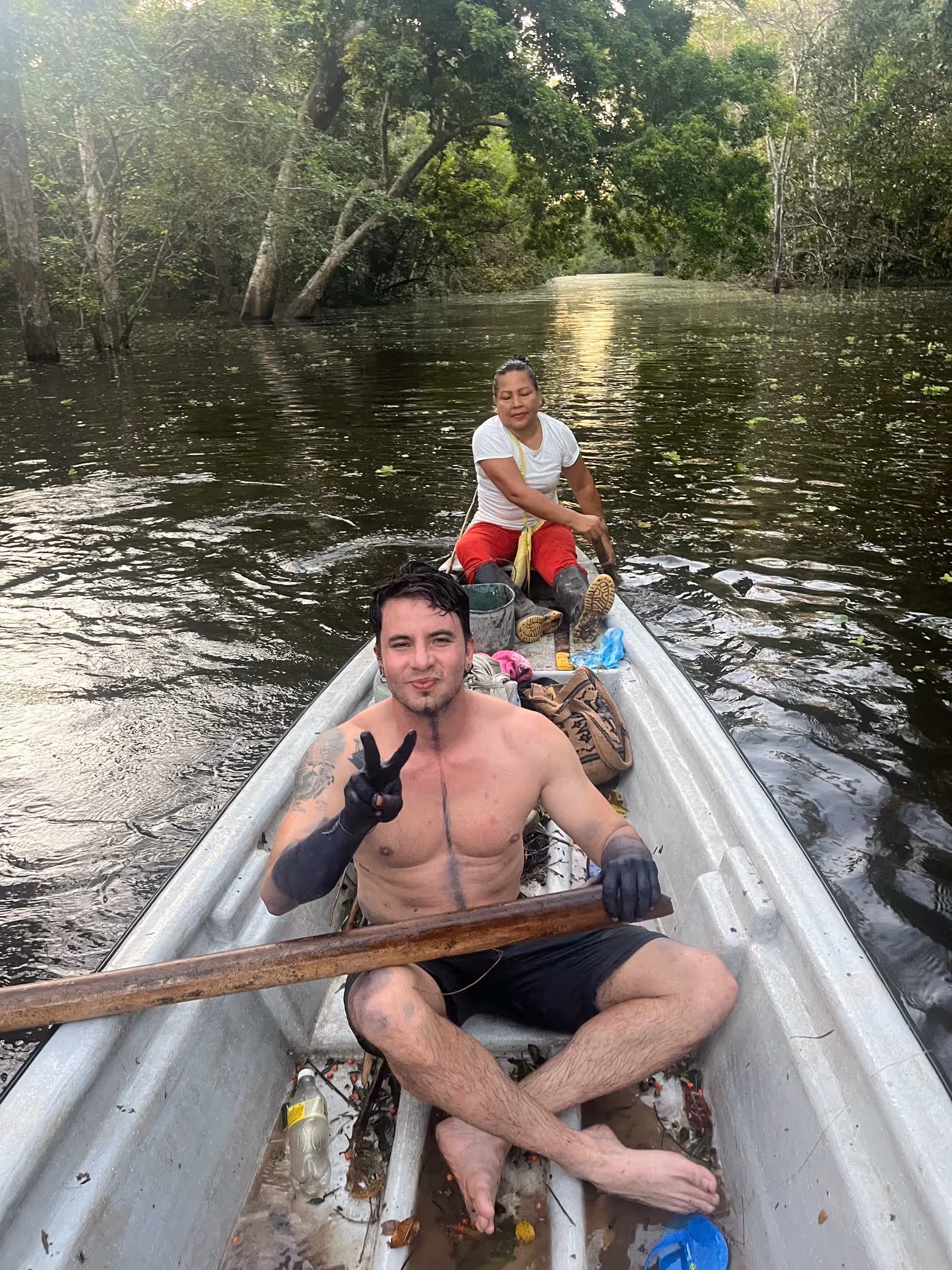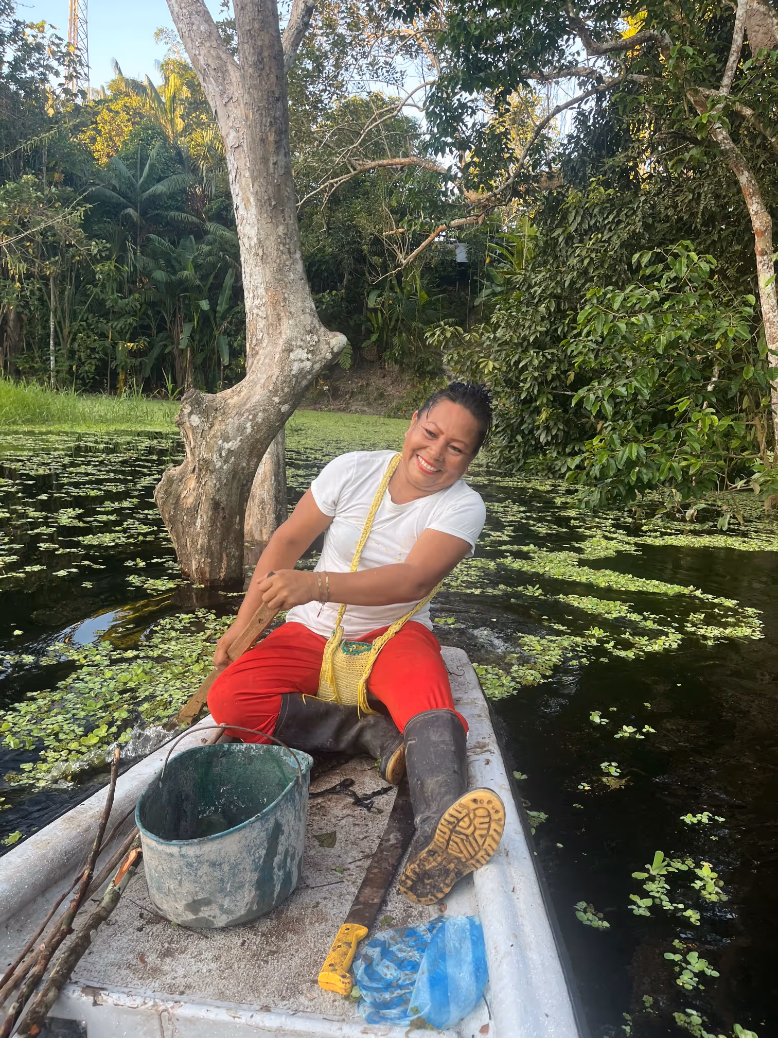 Luego fuimos a conocer la quebrada Yahuarcaca, nos llevó una prima de Jhon Sebastián a remo, pedimos permiso y nadamos. Recorrimos la comunidad desde la parte de atrás de las casas.