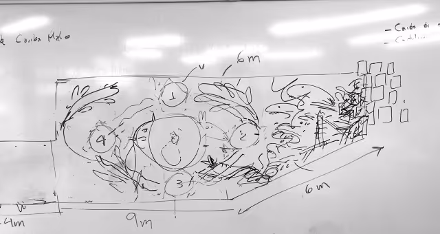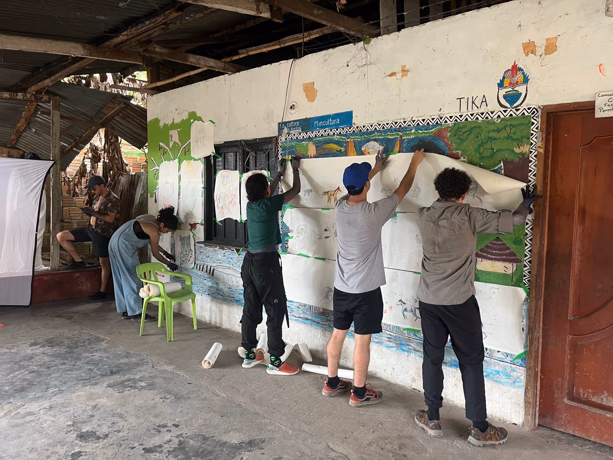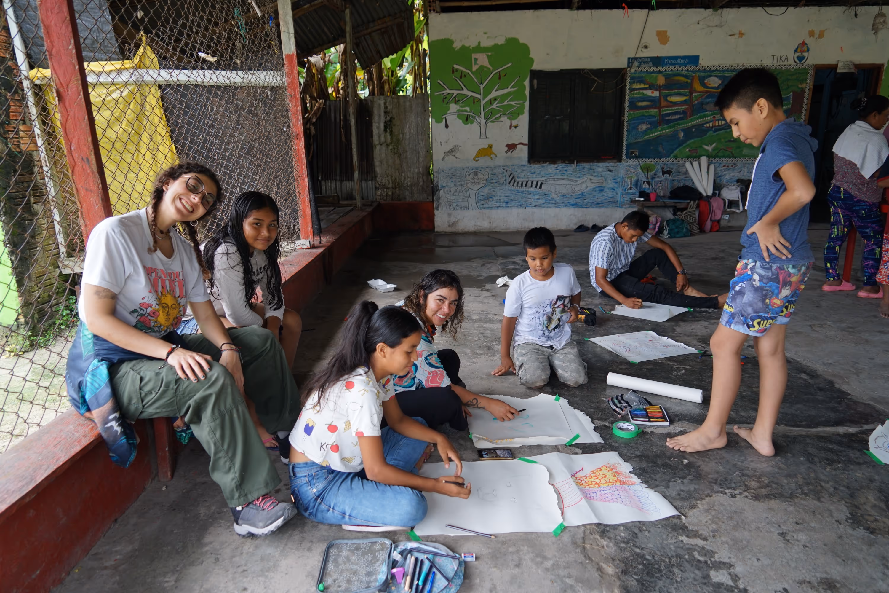 Inicia la bocetación del mural con sesiones de dibujo y planificación colectiva en torno a lo aprendido. Jhonier, artista del territorio, aporta sus bocetos, que dan forma a la estructura general: en el centro las comunidades aisladas y alrededor las cuatro organizaciones que les protegen: AIZA; PANI; AIPEA y CIMTAR.
