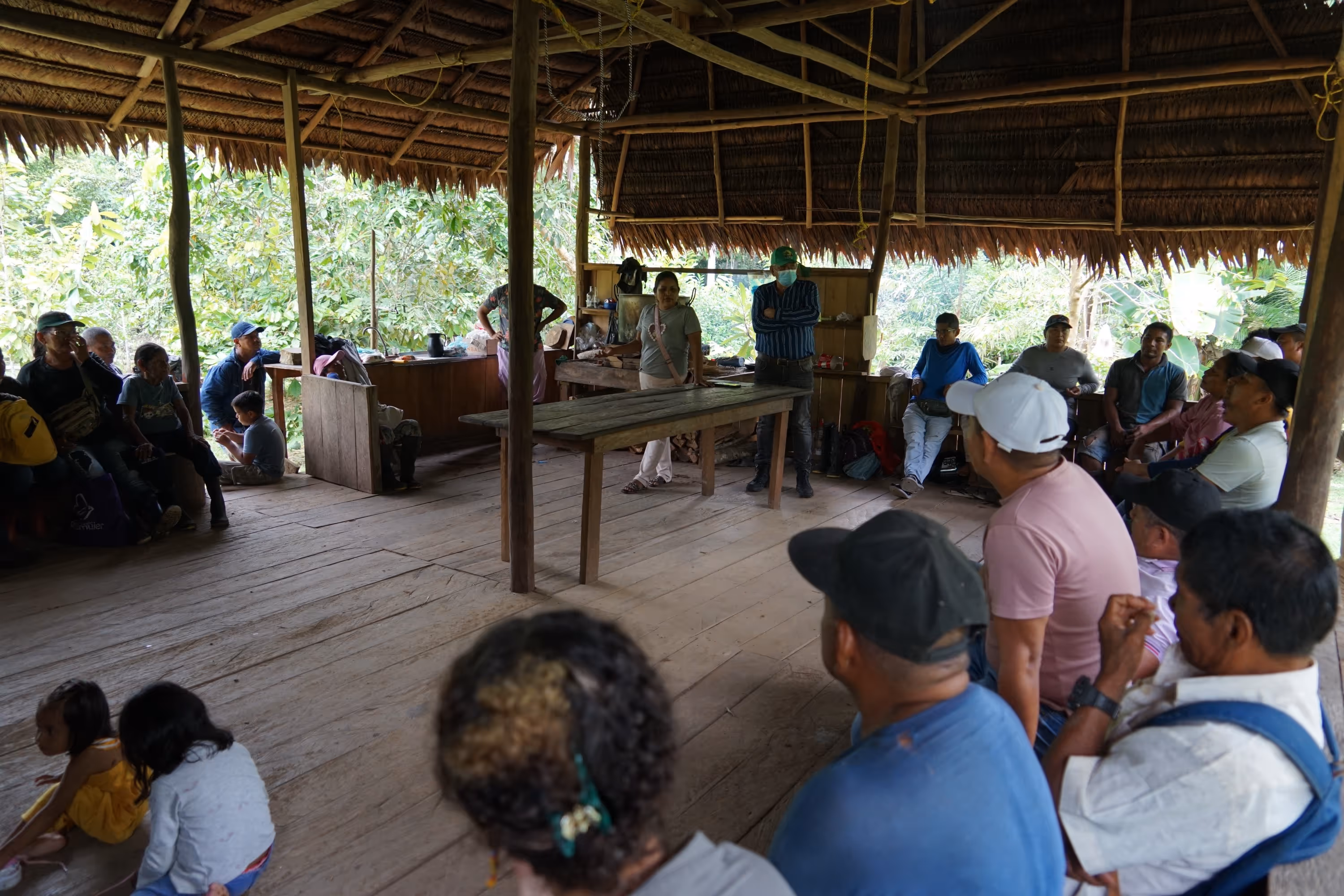 En la reunión con el cabildo de Arara, los compañeros Nixon y Jhon Sebastian presentaron sus preocupaciones sobre el Castañal. Luego de la pandemia con la muerte del abuelo Tigre, sabedor de la comunidad, empezaron a desenraizarse de sus tradiciones comunitarias. En Arara los sabedores defendieron la vitalidad de la lengua propia, la importancia de la curación con tabáco y ofrecieron aliarse con el Castañal Los Lagos. Arreglamos una reunión con los líderes que decidieron ayudar a la comunidad: Policarpa, Baudilio, y Nelson, junto con el cabildo de Castañal para el domingo.